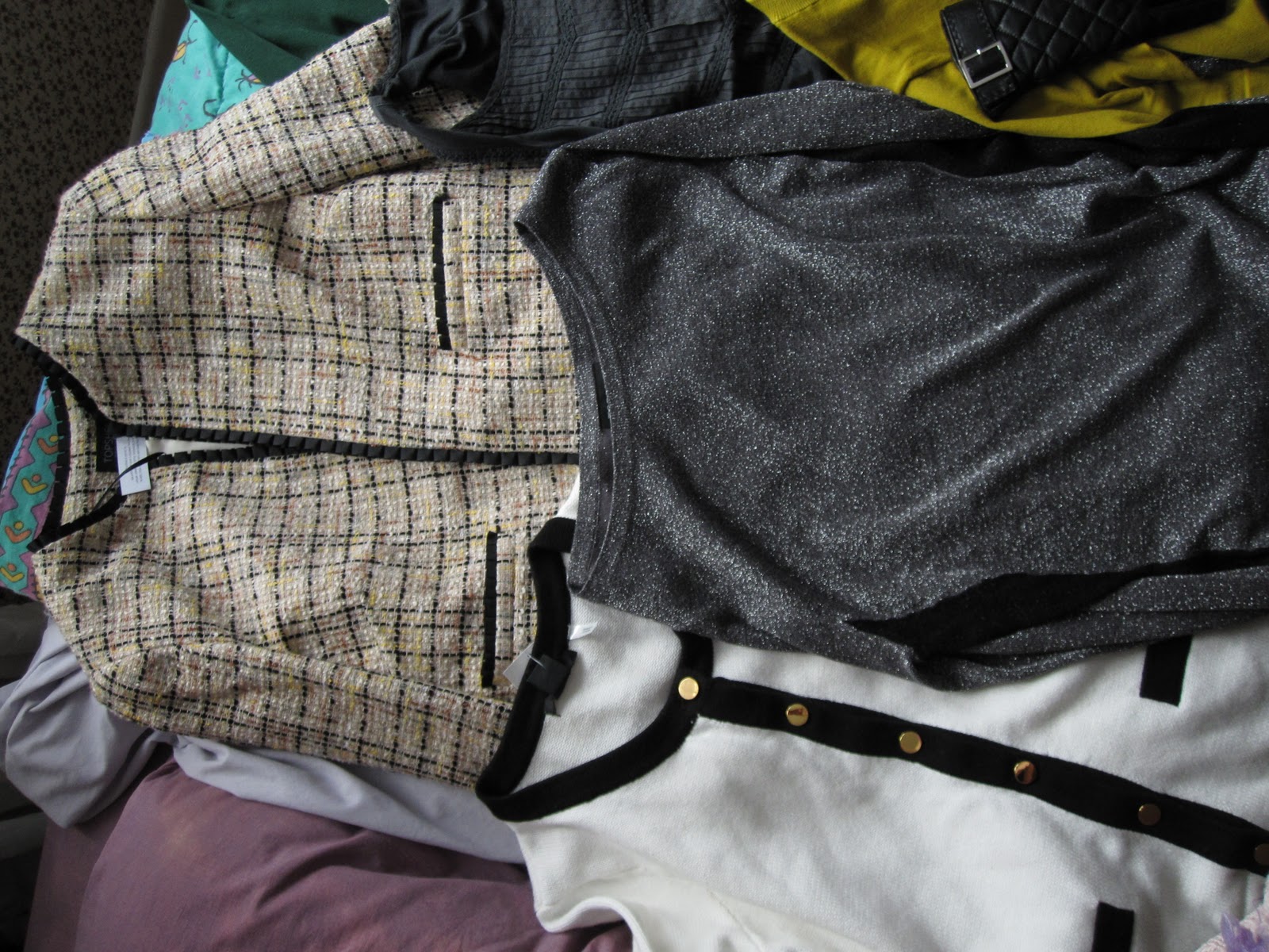 Topshop tweed blazer, glitter knit top and H&M black trim cardigan